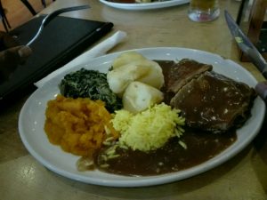 Before marching in unaware, we scoured the net for their menu, which turned out to be quite interesting. However, walking in was a surprise – All the patrons were pale and at least 3 times our age! Our eager waitress eased our minds though by suggesting their Sunday Special of either roast beef + trimmings, or a beef and Guinness pie for just R 65, BUT it was 11 am and the kitchen only opened at 12! We chose to wait it out and sip on a few drinks (our waitress brought the wrong ones but we forgive her).