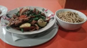 Our waiter was amiable, and had us “air-locked” when our food arrived in less than 5 minutes after our order was placed! Our respective foods gave new meaning to the phrase “enough to feed an army”. The portions were ridiculously generous, and bore no comparison to its price of R 88 per meal. The addition of chopsticks on each table was delightful to someone like me who relished the opportunity to learn how to use one for the first time.